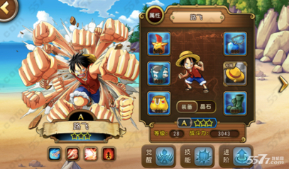 进入游戏玩家创建好自己的海盗团后就可以开始冒险了,刚开始我们就拥有主角A级路飞,然后跟着游戏教程走,会在酒馆中进行首抽获得A级撒谎布(每个人的首抽都是一样的,忍不住吐槽有木有)。之后进入副本,前期副本我们可以获得一些装备和材料,这些先给路飞装备进阶,前期路飞要做肉盾好长时间的,等通关游戏副本第二章海盗猎人佐罗后就可以获得A级佐罗,佐罗技能华丽好用值得培养。