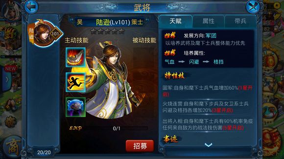 陆逊特性技2:自身和麾下坦克类兵种闪避+20%、格挡+20%