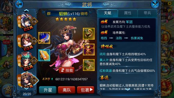 貂蝉特性技3:自身和麾下士兵气血增加60%