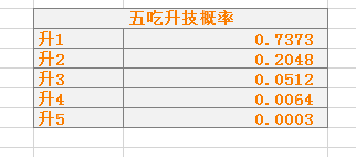 单吃不升技的概率为y(1-x)。则有,卡片五吃的升技概率为如下情况。