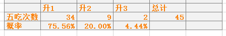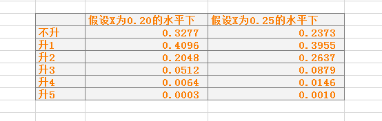 45次看似不多,但其实吃了45*5=225只,因此,上面的测试结果是有一定的参考价值的。这个结果与我一开始,将x假定为0.2的水平下所得到的结果非常吻合!几乎可以确定 单吃一张卡牌 升技的概率是20%!因此 我对于下面这个图中的概率的准确度 有一定的信心:
