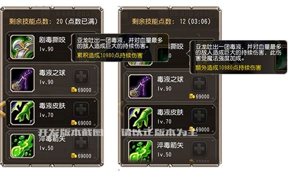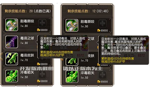 毒液之球:亚龙射出一小团毒液,对敌人造成魔法伤害,毒液将腐蚀敌人的护甲,并在一段时间内造成持续伤害。毒液效果可以叠加,最多叠加三层,每次叠加将刷新上次毒液效果的持续时间。
