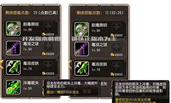 淬毒箭矢:亚龙在他的箭矢上淬毒,对越虚弱的敌方单位将造成越高的伤害,附加伤害受目标血量和技能等级影响。