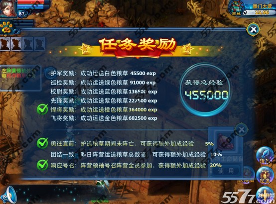 阵营运送粮草的总数将决定阵营对抗的结果,根据阵营的比赛情况,我们也会对强势和弱势的阵营做出分别的状态。阵营获得胜率,则全阵营可以获得大量的经验奖励。
