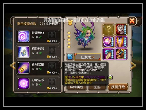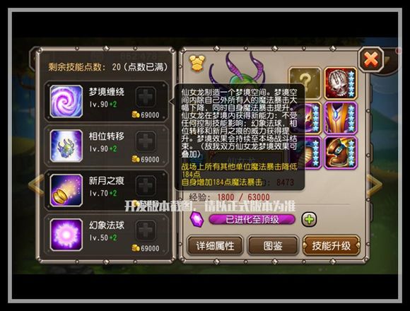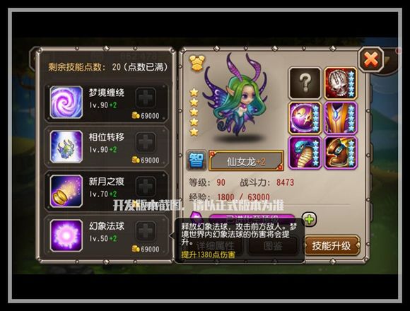 “看我七十二变~” 仙女龙会制造出一个梦境空间。在此梦境空间内,仙女龙能使其他人的魔法暴击降低,而自身的魔法暴击却会上升。并且处于此空间的仙女龙不受任!何!控制技能!影响哦!! 梦境效果会持续至本场战斗结束才会消失,在此期间,仙女龙其余的三个技能:幻象法球、相位转移和新月之痕的威力能获得提升。 如果敌我双方都有仙女龙,那么降低魔法暴击属性的效果便会叠加。