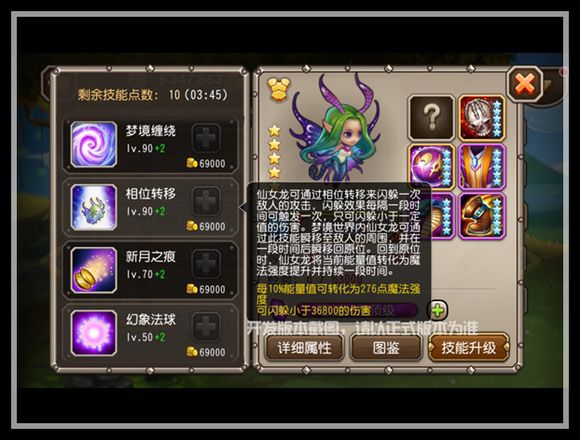 梦境世界内仙女龙一旦触发此技能,可以瞬移至敌人的周围,并在一段时间后瞬移回原位。回到原位时,仙女龙当前能量值转化为魔法强度并持续一段时间。