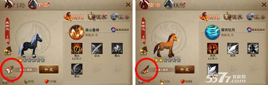 如上图可以看到,我们可以通过获取“龙筋、龙骨”分别来升星“烈马、铁骑”(达到一定星级就可以晋级哦)。也可以通过获取“稻草、豆粕”分别喂食升级“烈马、铁骑”(随着等级提升会增加基础附加“攻防血”属性以及马匹技能等级)。龙筋、龙骨、稻草、豆粕可以通过马场、义气商店、神秘商店获取。
