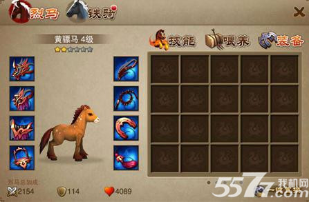 进入马场后我们可以点击“马厩”选择自己心仪的战马,我们可以选择两类“战马”,分别为烈马、铁骑,同时每类战马又分为两个系,烈马对应为风系、火系,铁骑对应为林系、山系,如图: