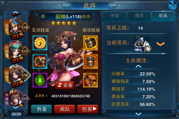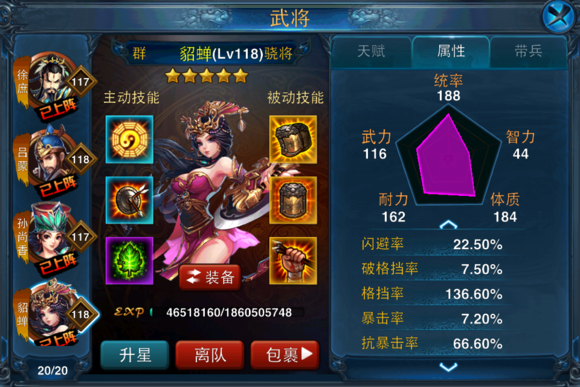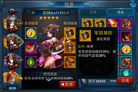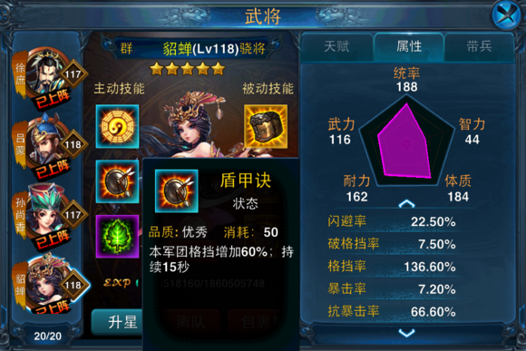 这是本人的貂蝉。这些技能基本都是为普通通天塔准备的。说一下思路。本人资源有限,所以没有练双闪——因为技能,因为炼化。军团盾防是不纯加30血的,武将格挡是纯的35的,军团坚韧是45纯的。炼化有2个都是4.5的红色格挡。如果炼化再好点,可以格挡有140.普通通天塔21-24的,武将基础攻击力并不是很高,但是他们的暴击后伤害很高,个人推测爆伤超过1000.格挡达到136.6,在普通通天塔的16-18层,基本不开技能也不会掉血,万一掉血,可以通过辅助开生生不息来加。到了19层和20层,由于对方将领会开乱石穿空,导致一次减血很多,所以有可能会被打败。尤其20层的坚韧将,放陨石非常致命。经常只剩下貂蝉和紧紧跟随的输出。所以,这个时候可以开2军团的加血60%技能——有可能助力推通普通通天塔。