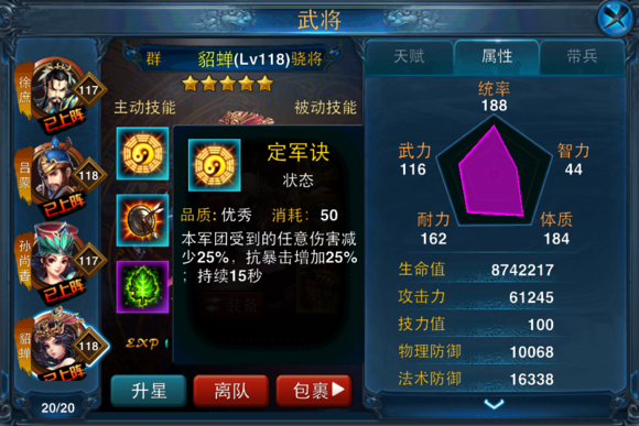 精英通天塔也是参照别人的阵型(这里先感谢哈),让一个输出回头,中路凿击几秒的方法,突破上路赵云。貂蝉用武将格挡还是军团25的格挡,本人都试过,感觉还是武将格挡好用。因为就算格挡加了25的小兵,还是很容易被庞统军团打掉,最后还是剩一个光杆貂蝉。本人是带辅助的,基本只要对方庞统不双开,在步练师生生不息的辅助下,都可以扛得住。当时绕后之后,如果姜维开了狂体,那是绝对扛不住的——推测姜维比庞统厉害很多,或者破格档比庞统高很多。如果顺利把输出打掉,打后面2个肉是很艰难的,所以这时候貂蝉的3军团加攻击力60%,持续20秒就碰上了用场,我方吕蒙如果开纯120狂体真诀,加上这个,比开势如破竹还要高,打精英通天塔的肉效果很好。