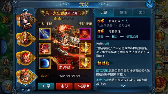 势如破竹/狂怒:太史慈必须带这个技能,实在没有橙紫的话就算是蓝绿也要带一个,秒后排无需主动攻击力加成,秒前排是肯定需要攻击力加成的。