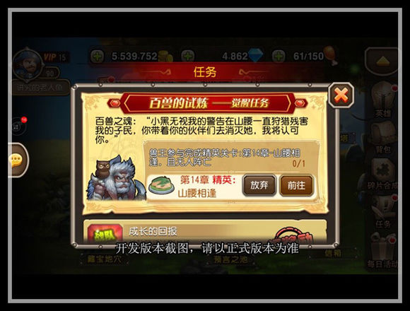 觉醒任务第三环:兽王参与完成精英关卡:第14章-山腰相逢,且无人阵亡,1次。