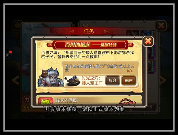 觉醒任务第二环:兽王参与完成矮人军工厂难度5或以上,4次。