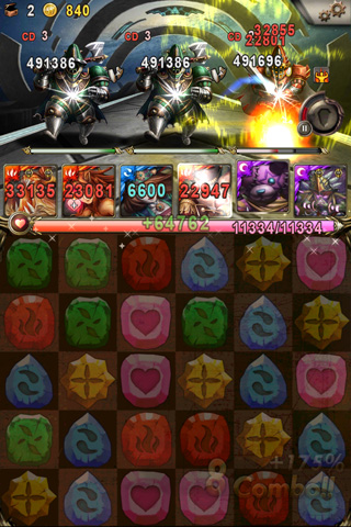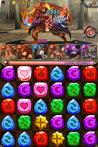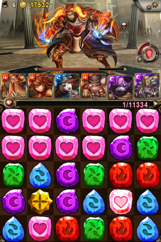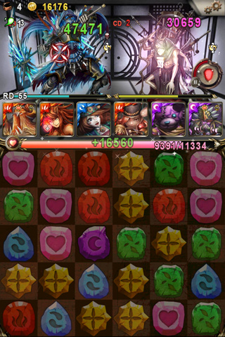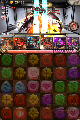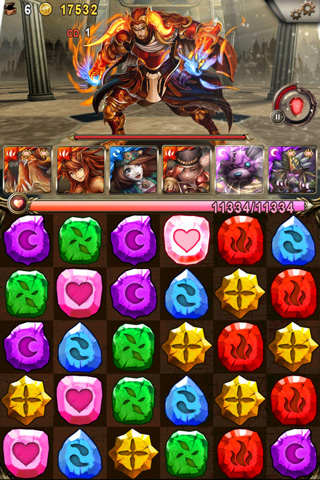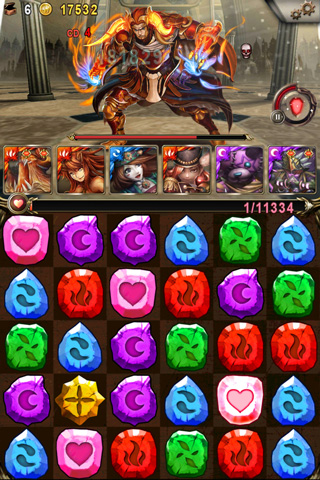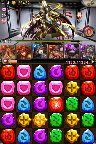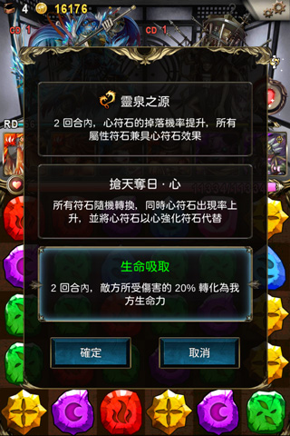 主动技能1:抢天夺日 ‧ 心 – 所有符石随机转换,同时心符石出现率上升,并将心符石以心强化符石代替