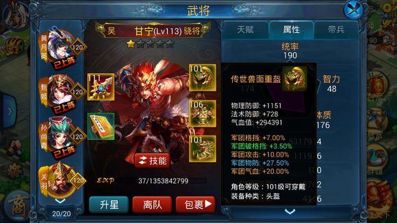金甘宁另外有一个特点是因其无双触发频繁,可以在精英塔里作为辅助坦克使用,不需要怒气支持的站桩能力比双防将要好得多。