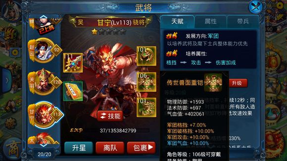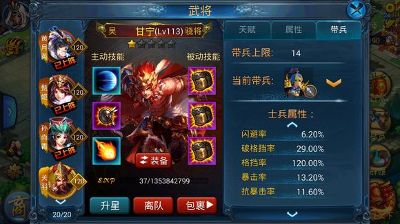 甘宁的防御能力只适合半肉半输出的骑兵枪兵,不适合盾兵女卫,而且本身属于双闪类型很吃数据,其本身的格挡比貂蝉低了19点,同时没有其他防御特性支持,因此不能在前排站桩硬吃伤害,否则连无双技都放不出来,如果要站前排那么起手就得施放格挡技能,这样能够有效的避免伤害并顺利施放无双技,但其极度贫血的特点依然不足以胜任主力坦克位置。