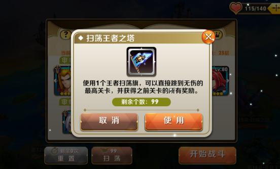 B、王者之塔每天可参与一次,当该层塔三星通关后,将开启本层塔的扫荡功能,免除重复推塔的负担,让你轻松拿奖励。