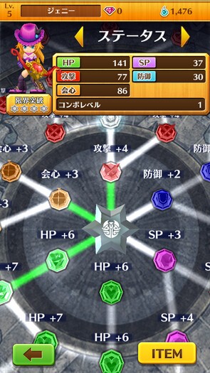 进入之后可看到魂盘的中央的标示,从中央连结到周围其他的位置,每一个位置代表着一种能力(通常是特定角色数值的增加,包括攻击、防御、会心、HP、SP、连段等级,也有的是特定的主动技能、自动技能和队长技能)