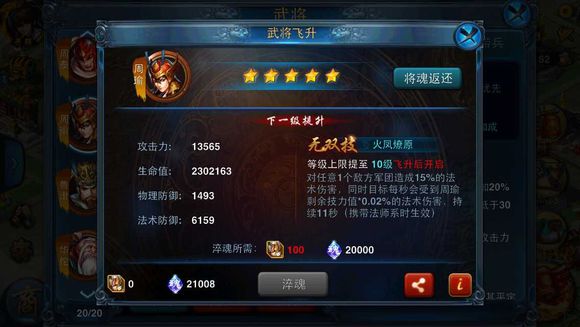 60级:对3个敌方军团造成40%的法术伤害,同时目标每秒会受到周瑜剩余技力值*0.16%的法术伤害,持续20秒。(携带法师系时生效)