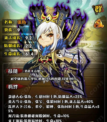 张角的防御和生命成长都是最顶级的一列,当只凭借这一点把他放在防御阵型里是不够了,他有着一个大大减少我方伤害的技能,能给我方全体武将增加75%的闪避,技能结合自身该有的闪避值,想被敌人攻击到都难。