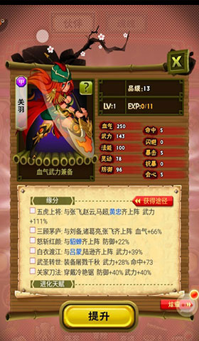 关羽:登陆第七天赠送,品级与嫦娥仙子一样,也是13,但是其缘分不太好搭配,毕竟人家也是五虎上将(这位我们中后期的搭配做好了一个铺垫),与貂蝉的缘分防御+22%,装备冷艳锯时防御+40%、武力+40%(冷艳锯的获得主要是在剧情是进入玛丽水管中开最后那个箱子获得碎片)。