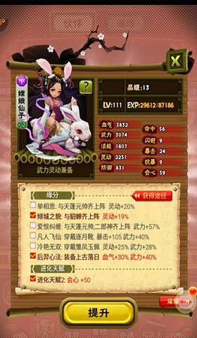 嫦娥仙子:登陆第二天赠送,品级13,属游戏中品级最高一类,武力灵动兼备,与貂蝉搭配(灵动+19%)、技能上古落日(血气+30%、武力+40%)。