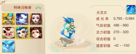天龙女在召唤兽界里以血厚著称,在战斗中,特别是玩家之间的PK中使用率最高。负敏的定位,使其可以有长久续航能力,成为正常战斗中坚实的肉盾。