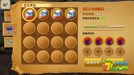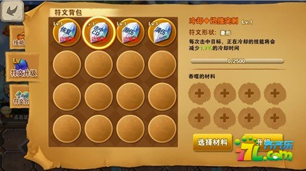 3.在符文升级面板中,选择需要升级的符文,在材料选择区域选择升级用材料,再点击"升级"就可以对该符文进行升级!