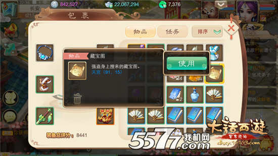 3、获得藏宝图之后,打开背包点击藏宝图,会出现挖宝按钮,点击会自动寻路到藏宝地点,挖掘即可。