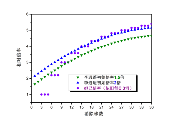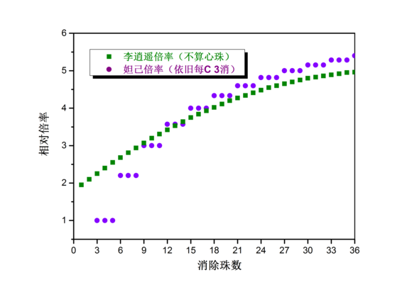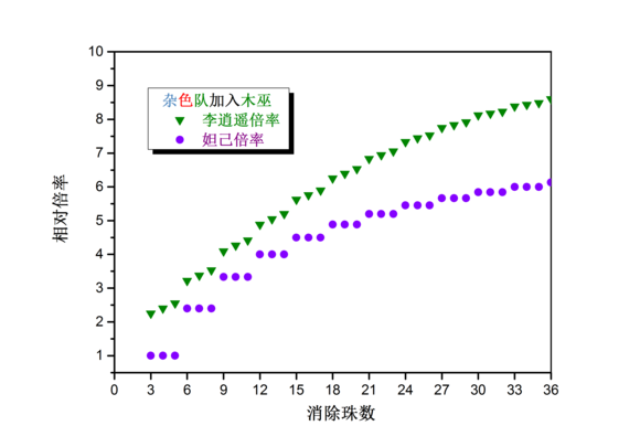 似乎妲己在倍率上与李逍遥同学还是有很大优势的,但是我们考虑的是每C都是3消的情况,事实上对新手来说消4,消5,消6都是常有的事情,为了直观的进行比较,我做了下面的图:
