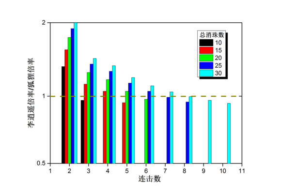 横坐标是连击数,纵坐标是李逍遥的倍率比上狐狸的倍率(数值越大证明李逍遥爆炸了,数值越小证明妲己虚区爆炸,等于1证明此时两张卡倍率一样)。图上能看出,李逍遥不少情况下效果都是优于妲己的: