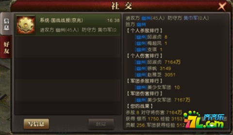 同时,在国战结束时,玩家还会过的一次国战总奖励,奖励数额根据玩家的击杀数量、对金甲卫和都督造成的伤害、以及战斗结果计算产生。总之在国战中杀敌越多,获得的奖励也会越多。