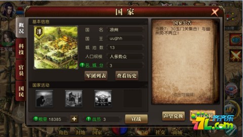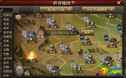 国王、丞相、大将军可以通过国家界面中的“宣战”按钮向其他城池宣战,宣战的目标必须是相邻的非本国城池。