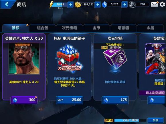 第三步:登陆游戏,然后什么都不点。(大家看第一步的图片,剩余时间是9分钟,然后看体力恢复时间,做个参考。也就是当我体力恢复至59个…时间是4分30秒的时候刷商店)再看本层图片,体力已经恢复至59,时间剩余2分28秒。也就是说商店已经刷新了,但是看最下面,限时特卖还是第一步图片那个东西。