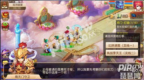 三界繁荣安定,百姓和睦幸福,西王母心内欢喜,突生妙想,邀三界异士赴瑶池盛宴,封赏青年才俊,以激励人心。各位少侠可以组队前往,与天兵比拼速度、与李天王一较高下、并且帮助天庭仙女招待老宾客,就能最终进入瑶池、摘得蟠桃啦!