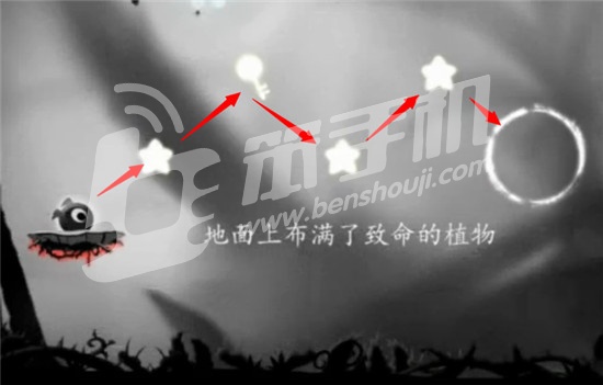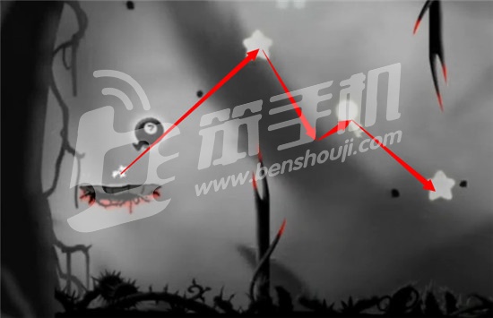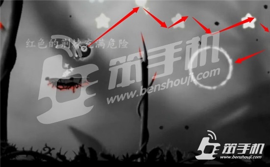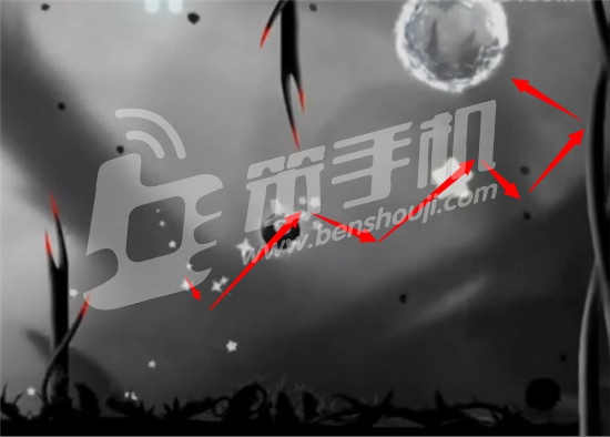 在第2关的时候会有尖刺,自然不能触碰红色的尖端,接下来只要按照下图标记的方法来行动就可以轻松的过关了,操作过程中起伏要操作好。