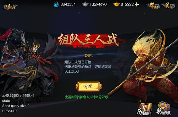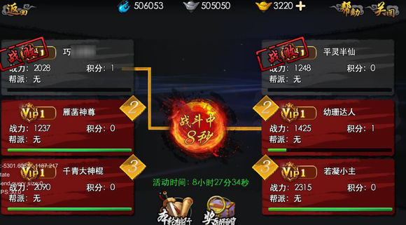 确认队伍后,进入小队界面,此界面玩家可以看到血量、战力、帮派、竞赛积分等信息,系统会根据仙友的战力匹配其他仙友组成小队,一旦确定小队组成就不能再更换队友,队友下线不会影响小队。然后会切换至寻找对手界面。