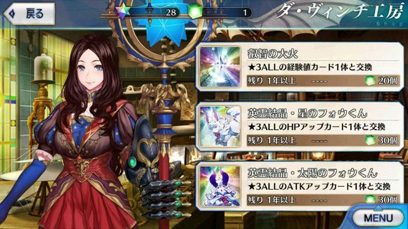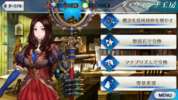 商店 可以购买晶石 开卡槽 角色 和 礼装 是分开的 晶石换取的物品现在没有出 估计活动吧 方块可以换取 第一个 经验卡 第二个 加hp卡 第三个加攻卡 具体什么效果 不清楚 希望有人得到了能告诉我 方块 每日任务 通关一个 可以得到一个 每个都做完的话 不管ap消耗的话 还是能得到挺多的方块 这个换的道具 应该以后会更换 最后一个 卖卡片 r卡可以换到3个方块 ssr估计10个? 再说次 记得锁卡 以免发生悲剧