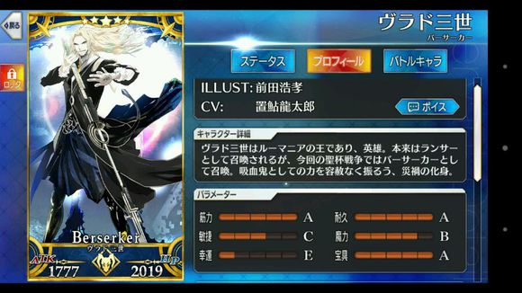 【弗拉德三世是罗马尼亚的王与英雄。本来应该是作为Lancer召唤的,在这次的圣杯战争中作为Berserker被召唤。无情地展示着作为吸血鬼的力量,是灾祸的化身。】