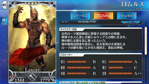 军神马尔斯与美丽的公主西尔维娅所生,与被当作神兽的狼为友被养育长大。合并了地中海周边国家,构筑了永恒荣光的大罗马帝国的基础的建国之王,真红的神祖。】