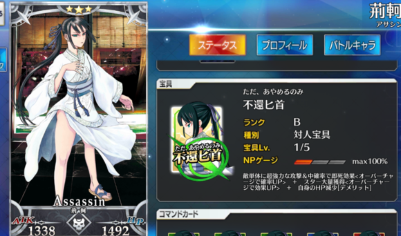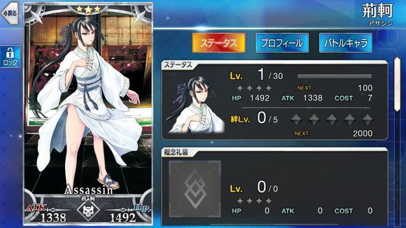【传言早有觉悟的荆轲在秦王的嘲笑之下被杀了。作为一个暗杀者,连暗杀的成果都没有达成的荆轲就像朝露一般消逝了。但是那个即使知道自己不能活着回来却毫不犹豫接下任务的荆轲,是无愧被称为天下之义侠的人物。】