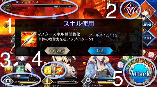 4、技能面板。从者可以发动的技能,点击之后按决定就能使用啦,有加防御、加攻击(幼帝的charisma)、甚至单体一回合无敌(盾娘)。满满摸索啦~