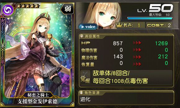 比较好入手的2C毒卡。毒受法强BUFF的影响,配合4费歌姬提升法伤的妖精牌,在4C回合内打出2C+2C(帽子)的COMBO,持续8回合的毒伤害总量非常高。而且毒属性是无视防御的,你可以叫他真实(LOL)/纯粹(D2)/神圣(war3)伤害2333