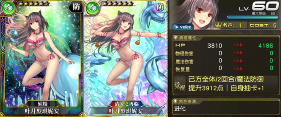 魔法防御卡,歌姬首次10连必出。4188HP,在没有克总的情况下可以用来撑血量,有克总建议拿掉,cost5太多容易卡手。