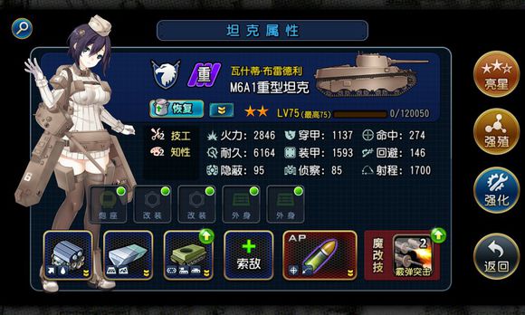 作为本游戏最容易获得的橙重(b2炮镜运载车?你有么。。反正我没有),科技上属于N4科技,属性也在M6A1的基础上增强了一些(不过装甲成长有点坑爹,只有4.3),不过并不能和N5的怪物比,亮三星后多一个特殊一个内壁,可以和M6A1一起作为主T使用,而且M6A2的隐蔽比A1还低,同科技能和火炮拉开3倍以上的隐蔽差距。输出基本和A1一样,具有钝头转正。
