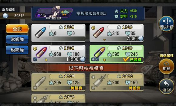M6A1的弹药选择AP科技,比较平衡的穿透和火力,附加属性钝头转正相当的好用,不会像脱壳和HEAT一样打个破猩猩火炮都要跳。