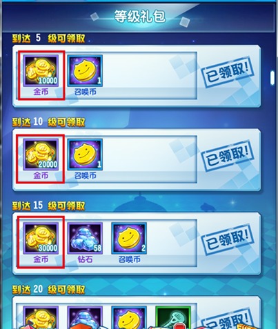 等级礼包:在角色90级之前,玩家升至5、10、15、20、25、30、35、40、45、50、55、60、65、70、75、80、85、90级均可领取大量金币和钻石奖励。