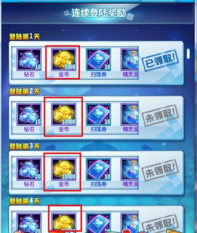 新手礼包:新手期间,从创建账号开始连续7天,每天都可领取一个礼包,其中可以获得大量金币。