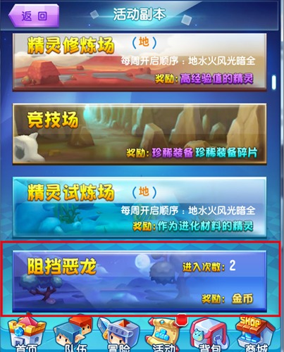 普通关卡(较多金币)、精灵修炼场(中等金币)、精灵修炼场(中等金币)、阻挡恶龙(大量金币)、勇者之树(中等金币)、角斗场(中等金币)、竞技场(中等金币)、失落神庙(少量金币)、潜力试炼场(中等金币)
