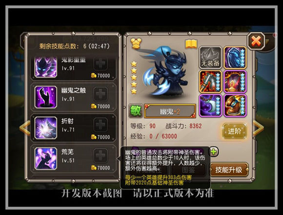 荒芜(普通):幽鬼的普通攻击将附带神圣伤害。场上的英雄总数少于10人时,该伤害还将获得额外提升,人数越少,额外伤害越高。